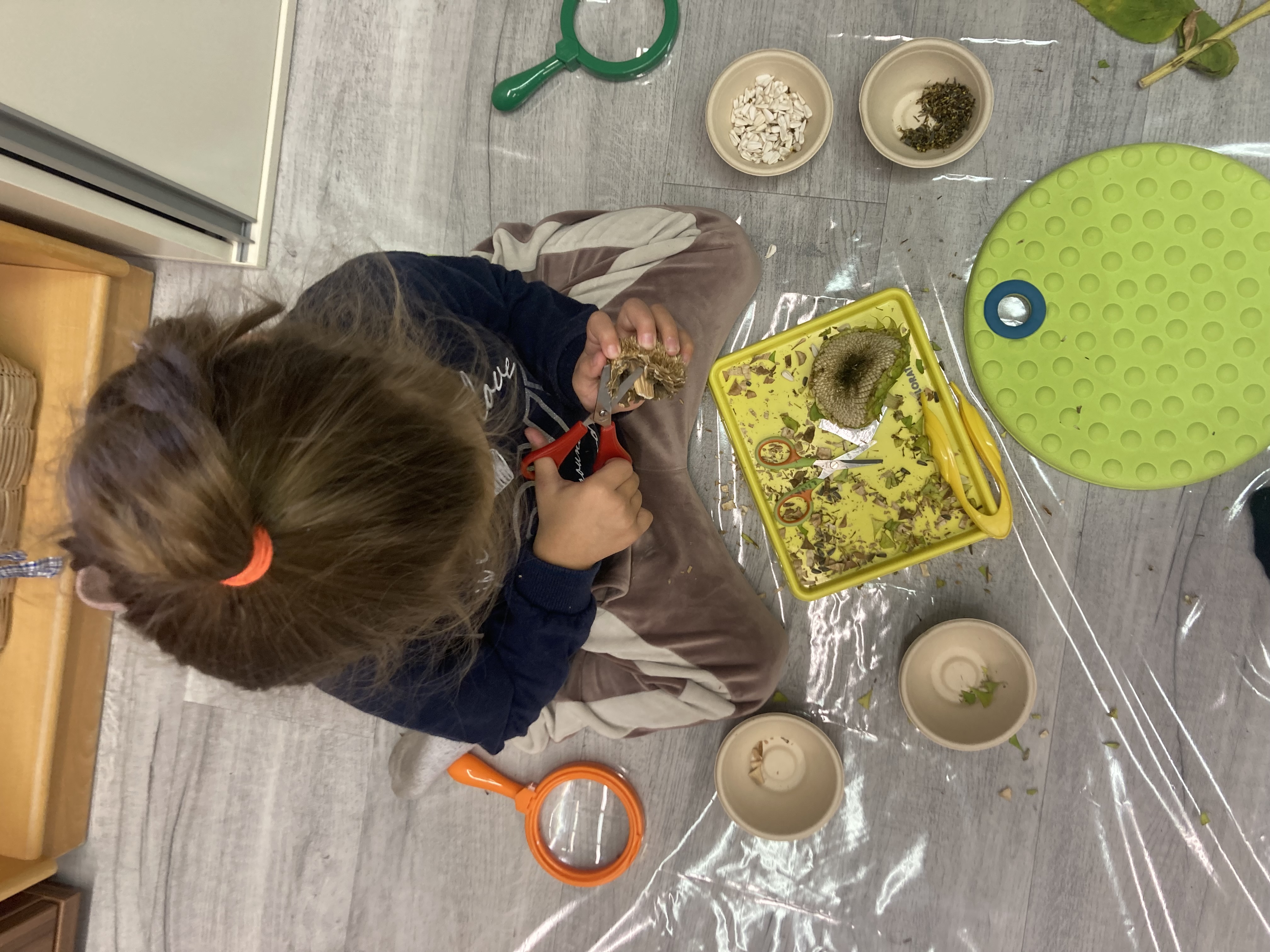 In unserem Forschungsatelier tauchen die Kindergartenkinder aktuell in das spannende Thema "Sonnenblume" ein. Unter dem Mikroskop und mit verschiedenen Werkzeugen wie Pinzetten, Scheren und den eigenen Händen erkunden sie die Bestandteile der Pflanze, entdecken Unterschiede und lernen, wie aus Blütenkorb, Kernen und Samen Leben entsteht. Die Kinder erfahren, welche wertvollen Aufgaben Sonne, Samen und Tiere miteinander verbinden – und wie wichtig Naturverträglichkeit und Fürsorge sind. Wusstet ihr schon, dass es Korb- und Zungenblüten gibt? Wer hat schon einmal selbst gefühlt wie „flauschig“ es im Korb der Sonnenblume ist. J., 4 Jahre, weiß das.