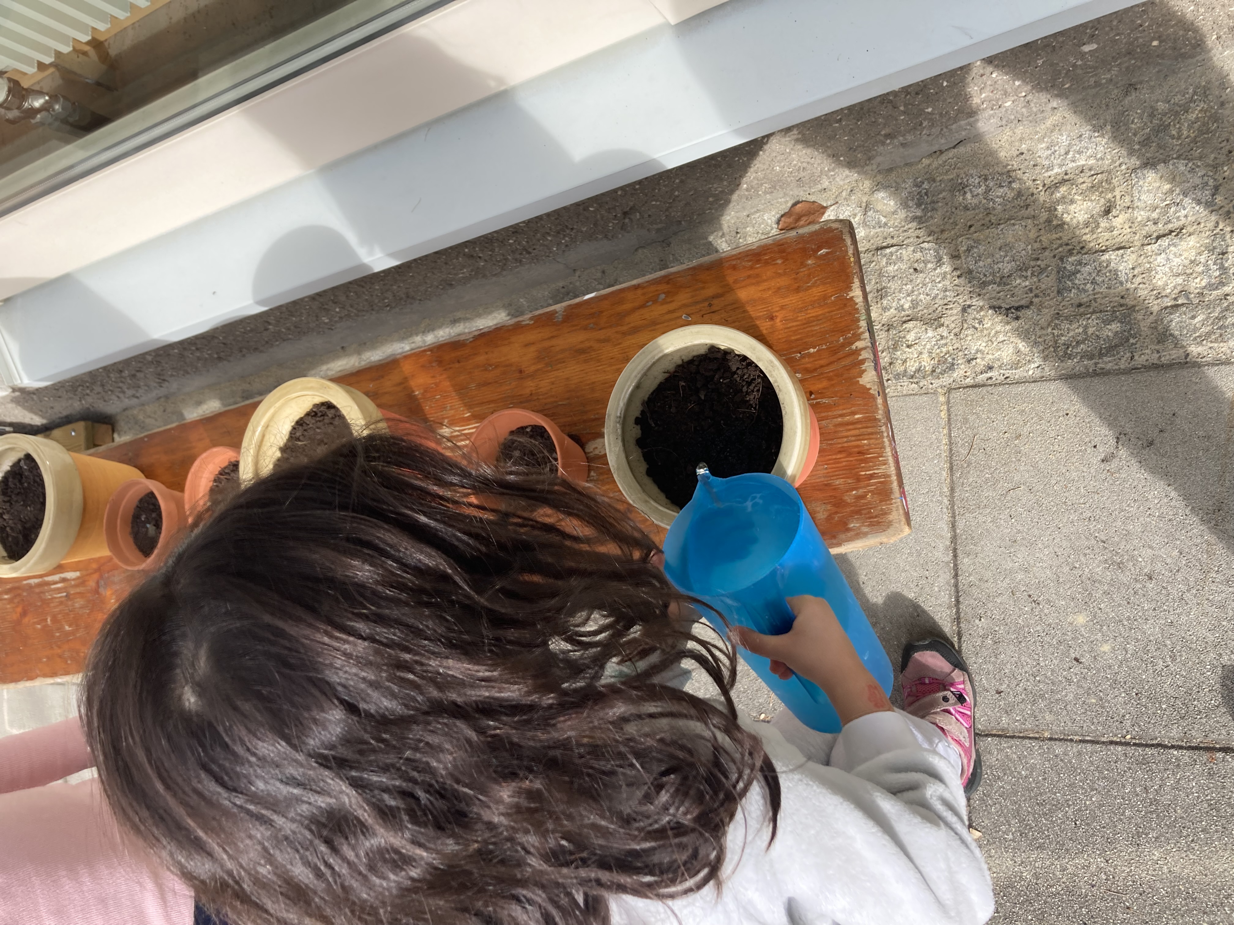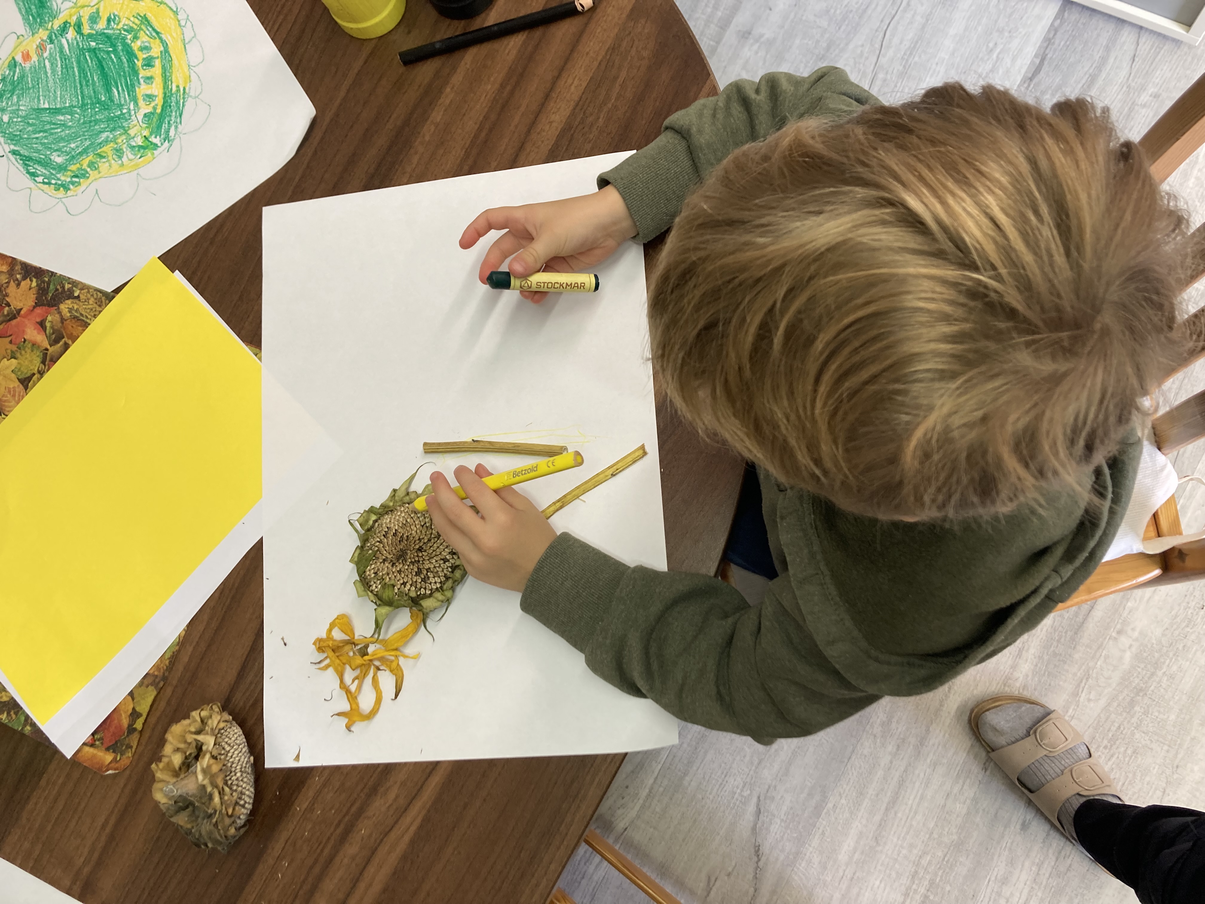 Außerdem entstehen Bilder von Sonnenblumen, die individuell von den Kindern gestaltet werden. Beobachtungen und Erfahrungen werden festgehalten, sodass jedes Kind seine eigene Lernreise sichtbar macht. Zusätzlich pflanzen die Kinder Kerne in Erde und erleben das Wachsen der Blume hautnah. Sie übernehmen Verantwortung für das Heranwachsen der Pflanze und lernen ganzheitlich – mit allen Sinnen.