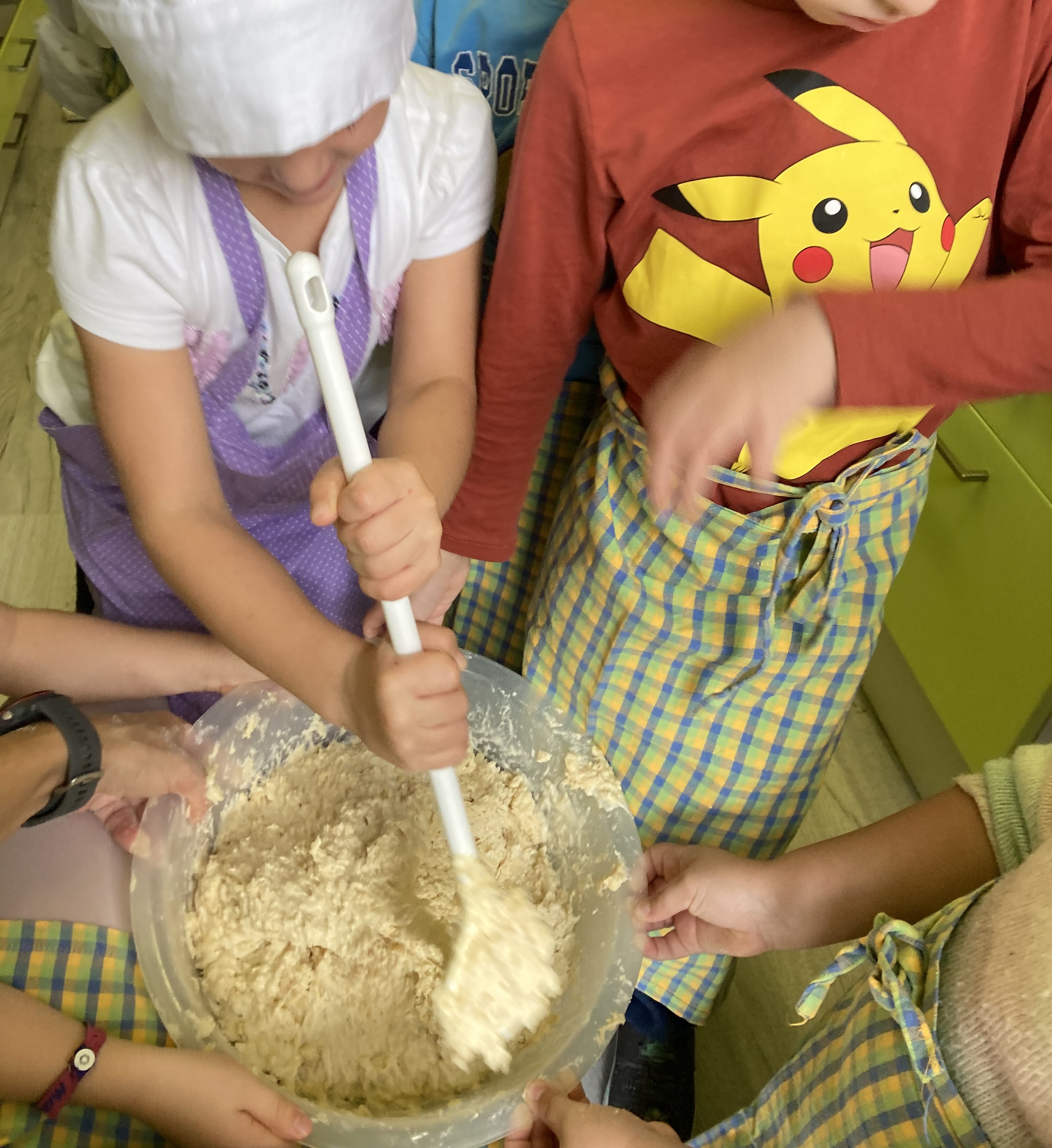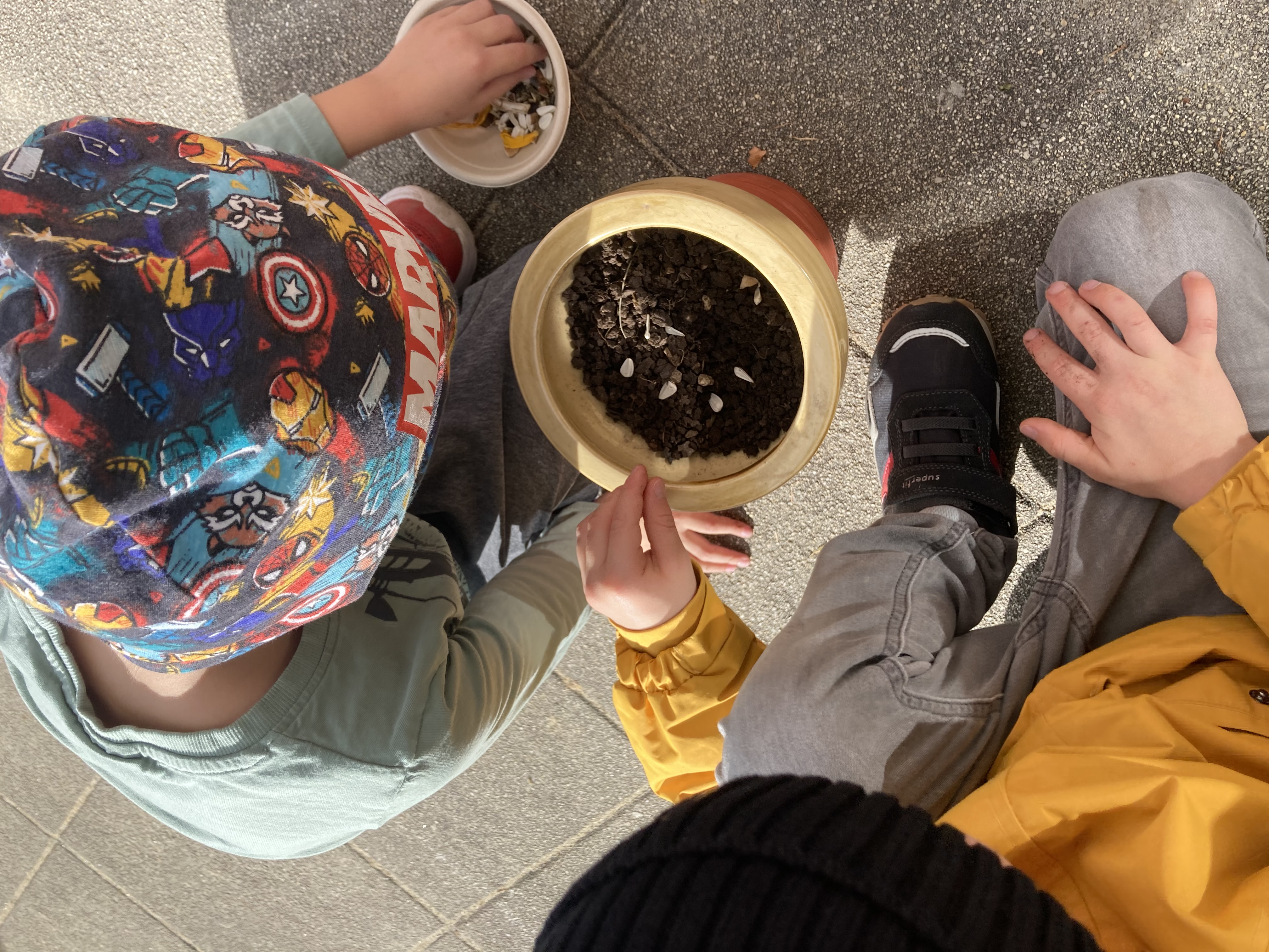 Besonders mitreißend ist das behutsame Entfernen der einzelnen Kerne aus dem Blütenkorb mit der Pinzette. Voller Eifer und Konzentration richten die Kinder ihre ganze Aufmerksamkeit auf diese sinnliche Betätigung. Die Kerne werden weiterverarbeitet: zu leckeren Brötchen und später auch zu Futter für die Vögel – so erwerben die Kinder Weltwissen und Erkenntnisse über direkte sinnliche Erfahrungen.